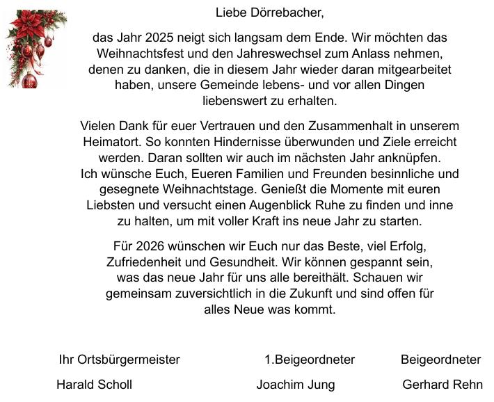Sponsoren: Die Kirchengemeinden, kath. Frauengemeinschaft, ev. Frauenhilfe, Blaskapelle Dörrebach, Freunde der Feuerwehr Dörrebach, Kindergarten -und Jugendförderverein, SSV Dörrebach und der Seniorenclub. Dörrebach |