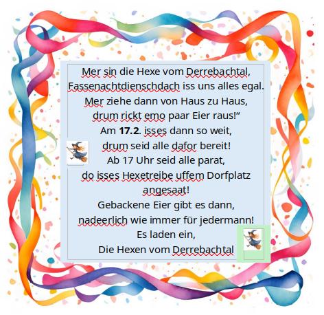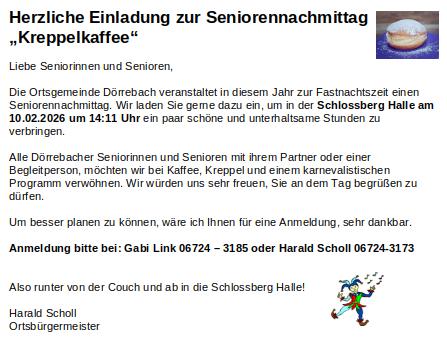 Herzliche Einladung zur Seniorennachmittag „Kreppelkaffee“Liebe Seniorinnen und Senioren, Die Ortsgemeinde Dörrebach veranstaltet in diesem Jahr zur Fastnachtszeit einen Seniorennachmittag. Wir laden Sie gerne dazu ein, um in der Schlossberg Halle am 10.02.2026 um 14:11 Uhr ein paar schöne und unterhaltsame Stunden zu verbringen. Um besser planen zu können, wäre ich Ihnen für eine Anmeldung, sehr dankbar. |