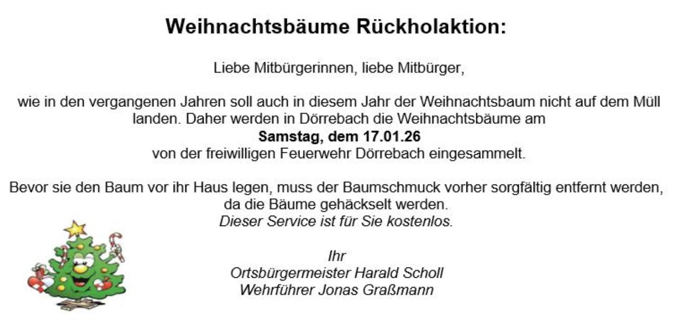 Weihnachtsbäume Rückholaktion: Liebe Mitbürgerinnen, liebe Mitbürger, Samstag, dem 22.01.22 eingesammelt. Bevor sie den Baum vor ihr Haus legen, muss der Baumschmuck vorher sorgfältig entfernt werden, da die Bäume gehäckselt werden. Dieser Service ist für Sie kostenlos. |
